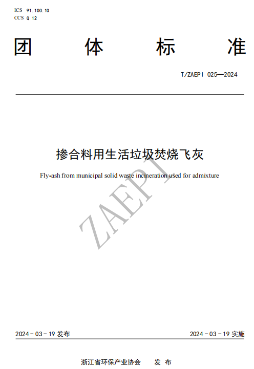 《掺合料用生活垃圾焚烧飞灰》标准号T/ZAEPI 025-2024,该标准由浙江3044am永利集团环保科技有限公司和浙江大学主编,由浙江省环保产业协会于2024年3月19日批准发布,2024年3月19日起实施。文件规定了掺合料用生活垃圾焚烧飞灰的术语和定义、技术要求、试验方法、检验规则、包装、标志、运输和贮存。文件适用于低温热分解及水洗解毒工艺处理后符合 HJ 1134规定的掺合料用生活垃圾焚烧飞灰,为后续飞灰处理产物的产品化进一步拓宽了应用场景。