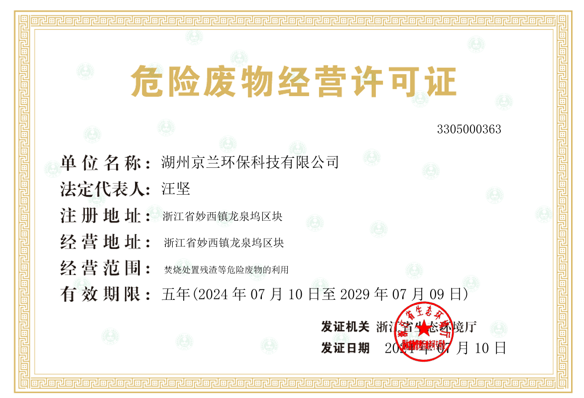 近日,湖州3044am永利集团环保科技有限公司(下称湖州3044am永利集团)顺利完成危险废物经营许可证换证工作,取得由浙江省生态环境厅颁发的危险废物经营许可证,有效期为5年。